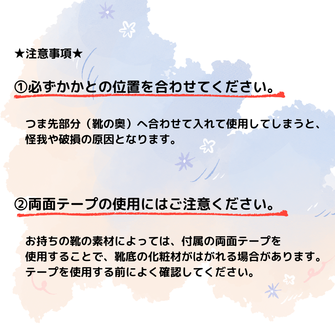 つま先部分(靴の奥)へ合わせて入れて使用してしまうと、怪我や破損の原因となります。